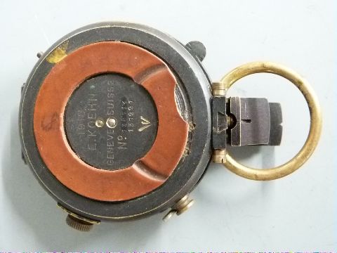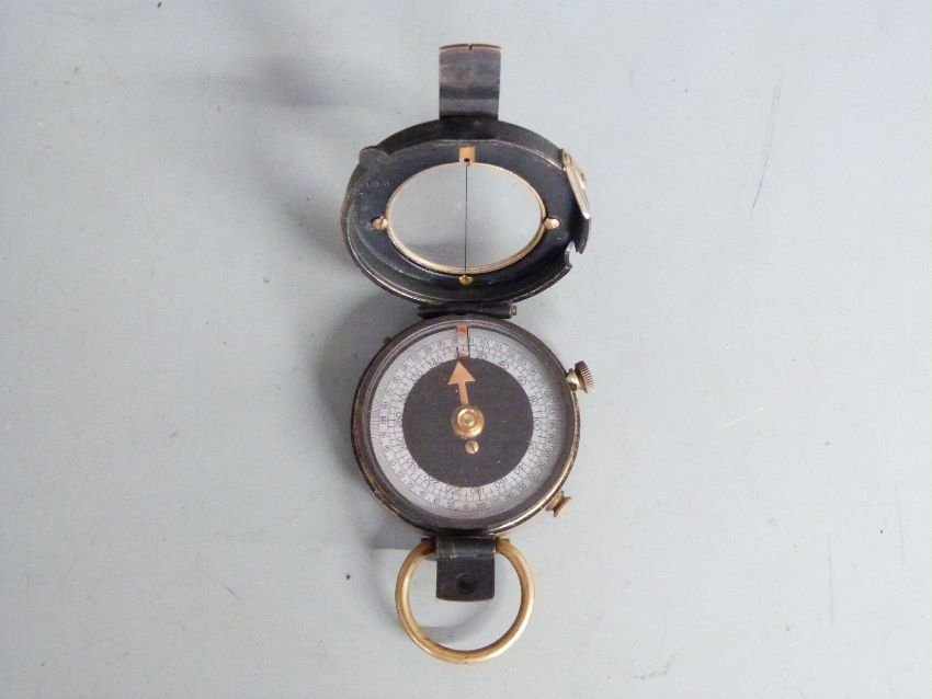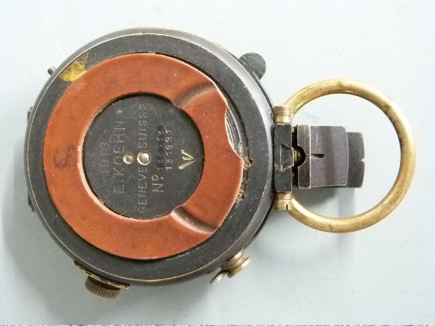 WWI prismatic compass by E Koehn, Geneve, Suisse, no 138714, dated 1918, broad arrow mark, with leather case dated 1918, stamped D Stock, Edinburgh