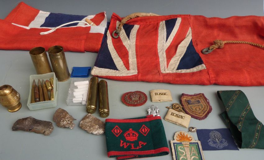 Union flags, cloth badges, small shell cases, shrapnel etc