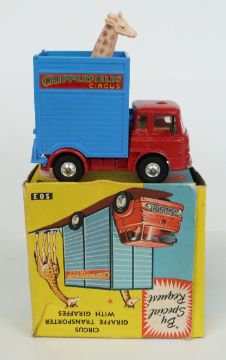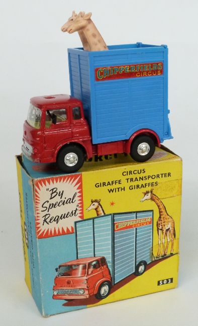 Corgi Toys diecast model Circus Giraffe Transporter With Giraffes with red body, lemon interior, blue crate, Chipperfields Circus decals and two giraffes 503, in original box.