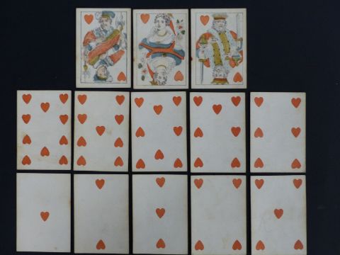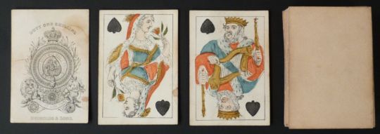 Reynolds & Sons, England playing cards. Old Frizzle ace. Non-standard double-ended courts based on the North German pattern, square corners, no indices. Plain backs. 52 cards. c1860