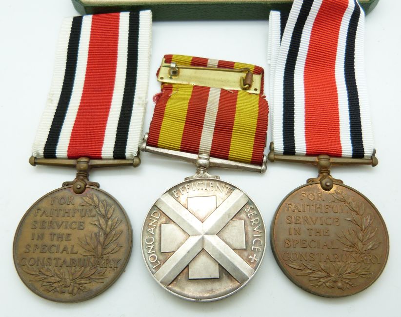 Two Special Constabulary medals for faithful service named to William Myers and Henry Barradell together with a Voluntary Medical Service Medal named Elizabeth Reus, with box and a Womens Voluntary Service Medal, boxed