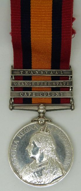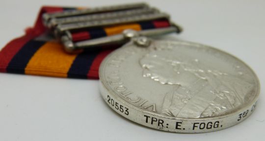 British Army Queen's South Africa Medal with clasps for Cape Colony, Orange Free State and Transvaal, named to 20553 Tpr E Fogg, 3rd Company Imperial Yeomanry