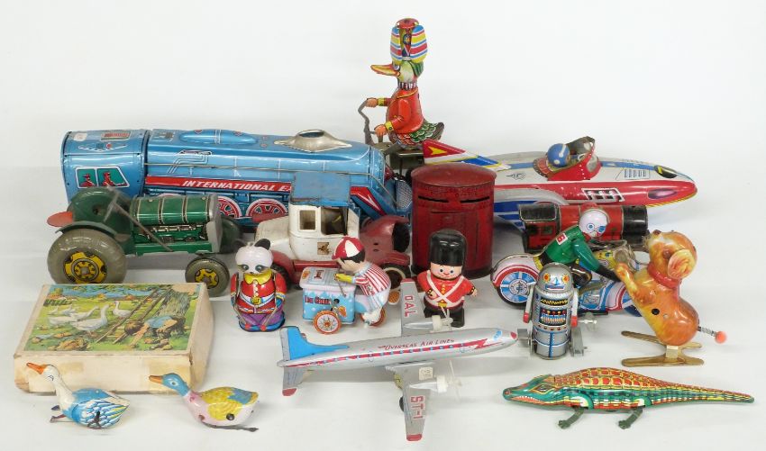Seventeen tin-plate toys mostly clockwork including a Hornby 0 gauge train, robot, aeroplanes, motorcycle rider etc together with a set of picture blocks in original box