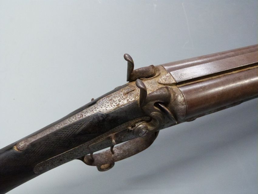 R & W Aston 12 bore side by side hammer action shotgun with named and engraved locks, engraved underside, rotary underlever, hammers and top plate, chequered grip, vacant cartouche to the underside of the stock, storage compartment to the stock engraved with a tiger, double trigger, pop up sights and 30 inch unchoked Damascus barrels, overall length 118cm, length of pull 36.5cm, NVSN, PLEASE NOTE THIS GUN IS BEING SOLD AS STOCK AND ACTION ONLY AND THAT A VALID RELEVANT FIREARMS/SHOTGUN CERTIFICATE IS REQUIRED TO HANDLE/PURCHASE THIS ITEM.