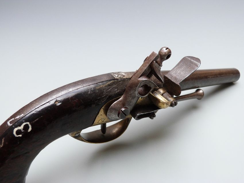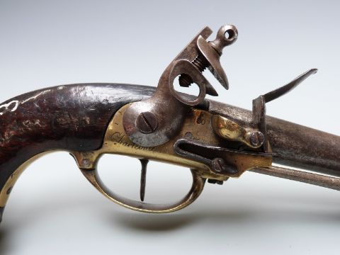 Flintlock hammer action Charlivelle model 1777 pistol with named brass lock, trigger guard and butt plate, steel ram-rod and 7 inch barrel, overall length 34cm