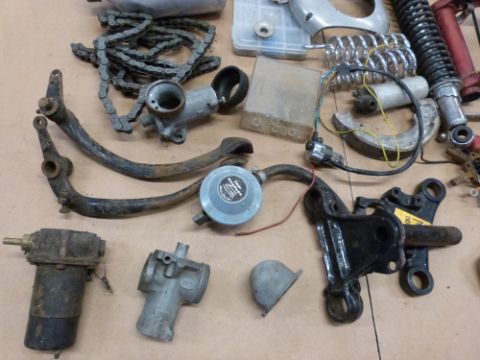 A quantity of motorcycle spares including BSA footbrakes, FS1E yokes etc