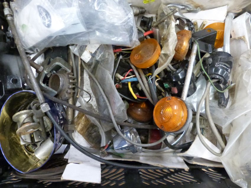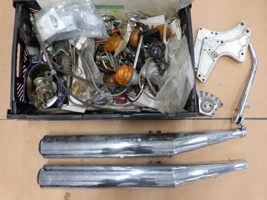 Box of Norton Commando motorcycle parts including silencers, indicators etc