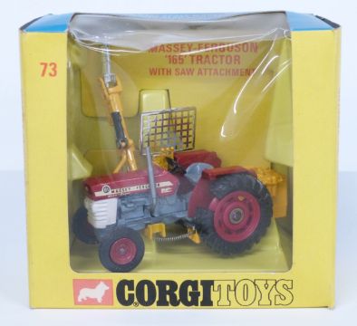 Corgi Toys diecast model Massey-Ferguson '165' Tractor With Saw Attachment with red body and hubs and yellow attachments 73, in original window box
