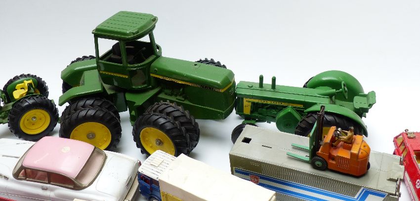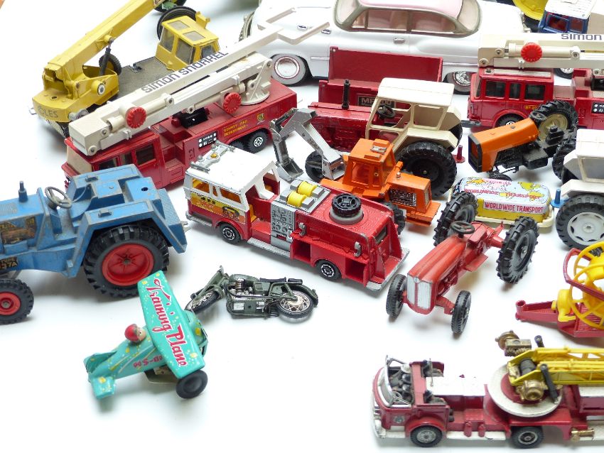 Over 30 Corgi, Dinky, Matchbox and similar diecast model vehicles including fire engines, large scale John Deere etc