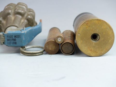 A small collection of militaria including inert ammunition, a practice hand grenade, clasp knife etc