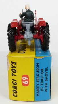 Corgi Toys diecast model Massey-Ferguson '165' Tractor With Shovel with red body and hubs, silver shovel and driver 69, in original box with card insert.