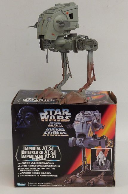 Five Star Wars action figures and vehicles including Imperial AT-ST, in original box, AT-AT Walker etc together with a collection of Walkers Star Wars Tazos in four folders