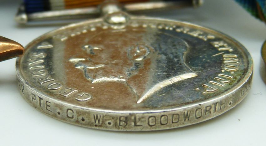 British Army WWI medals comprising 1914 'Mons' Star with clasp, War Medal and Victory Medal, named to 9822 Pte C W Bloodworth, 1st Battalion, Glosters/ Gloucestershire Regiment (Mons Star named to CW Bloodwork)