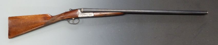 AYA 12 bore side by side shotgun with named locks, line engraved locks, underside trigger guard, top plate and thumb lever, chequered grip and forend, double trigger and named 28 inch barrels chocked ½ and full, overall length 114cm, length of pull 37.5cm, serial number 580973 PLEASE NOTE THAT A VALID RELEVANT FIREARMS/SHOTGUN CERTIFICATE IS REQUIRED TO HANDLE/PURCHASE THIS ITEM.