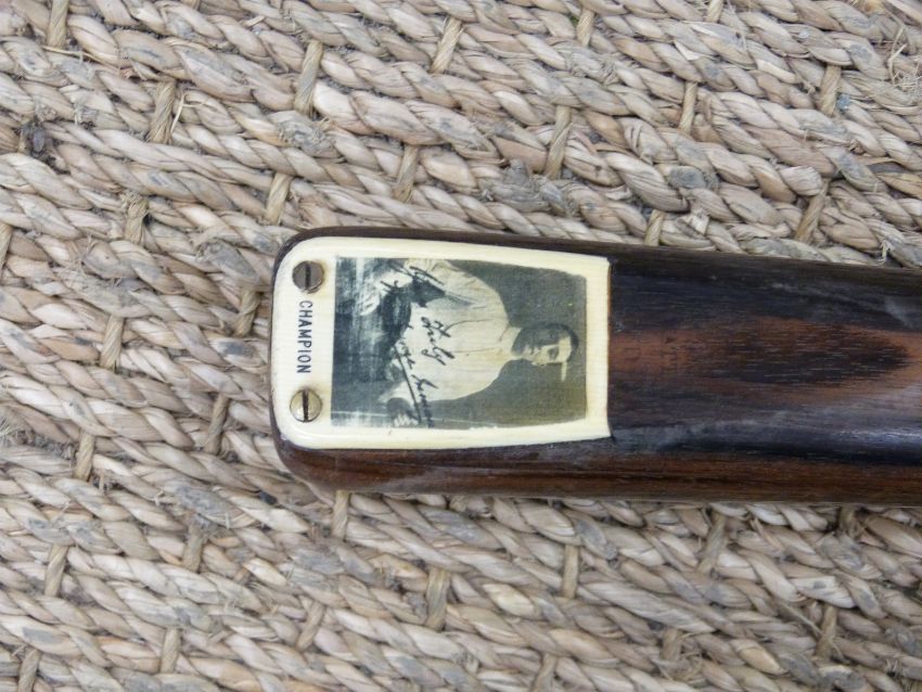 Stevenson "champion" billiard/snooker cue with ivorine portrait plaque to base by Burroughs and Watts in metal case