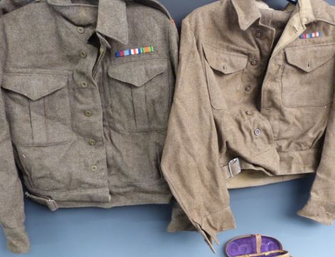 British Army WWII battle dress blouse/jacket, 1940 pattern, together with a later example, both R.A.O.C and Major's rank insignia together with two pairs of binoculars, one Carl Zeiss Jena, kit bag etc.