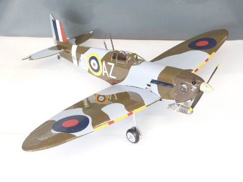 Kit built petrol powered radio controlled model Spitfire aeroplane together with the plans, spares, accessories and transmitter