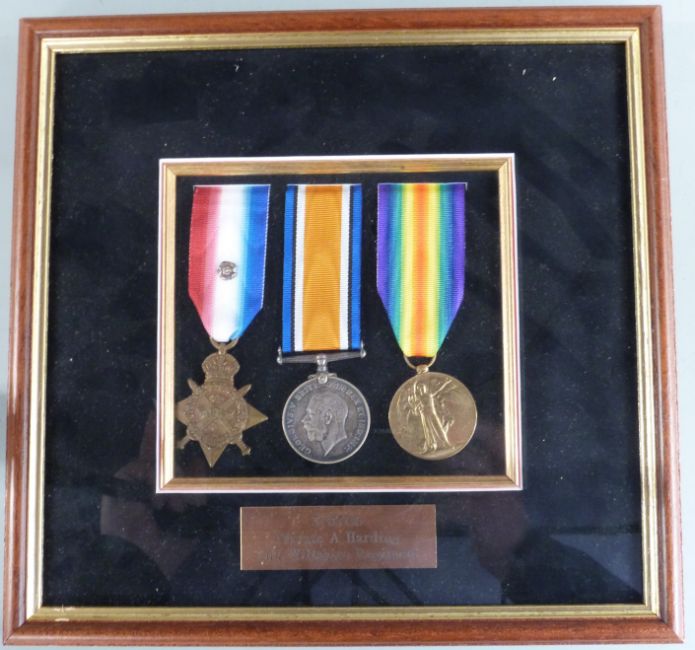 British Army WWI medals comprising 1914 'Mons' Star with silver rosette, War Medal and Victory Medal named to Pte A Harding Wiltshire Regiment, framed and mounted