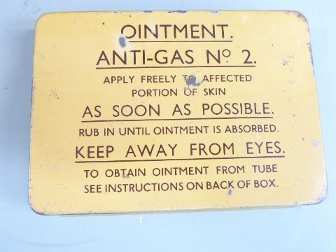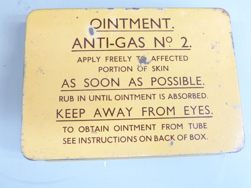 British Army WWII gas mask with canister, eye shields and full ointment tin