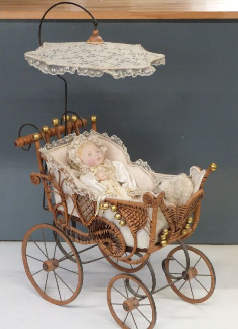A childs dolls pram, with wicker basket and lace parasol together with three dolls and a Teddy Bear
