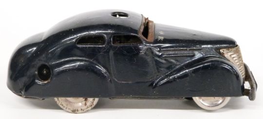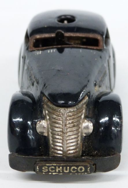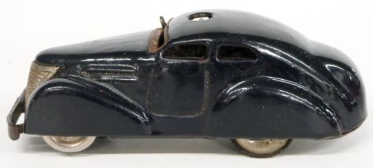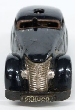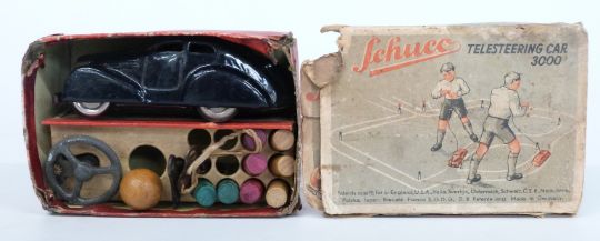 Schuco clockwork tinplate Telesteering Car 3000 with blue body, in original box with steering wheel, key and bollards.