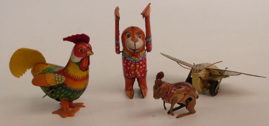 Eleven clockwork tinplate and plastic toys, including Disney Goofy, monkey, cats etc.