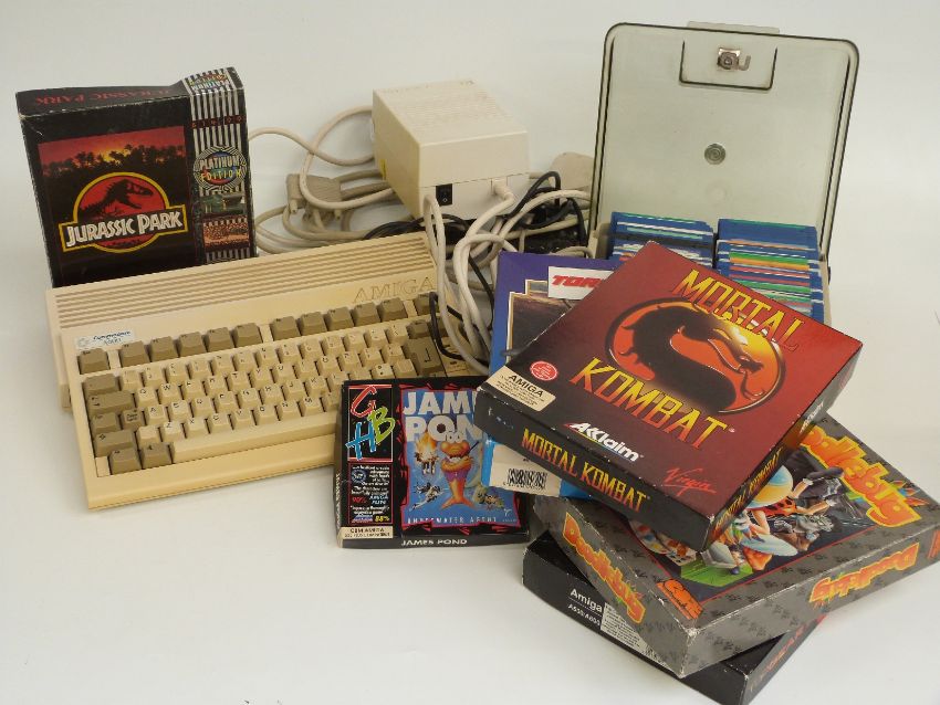 Commodore A600 Amiga games console together with joystick and various games including Mortal Kombat, Top Gear 2, Jurassic Park etc, some in original boxes