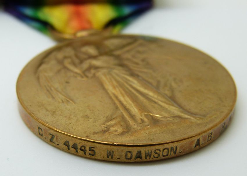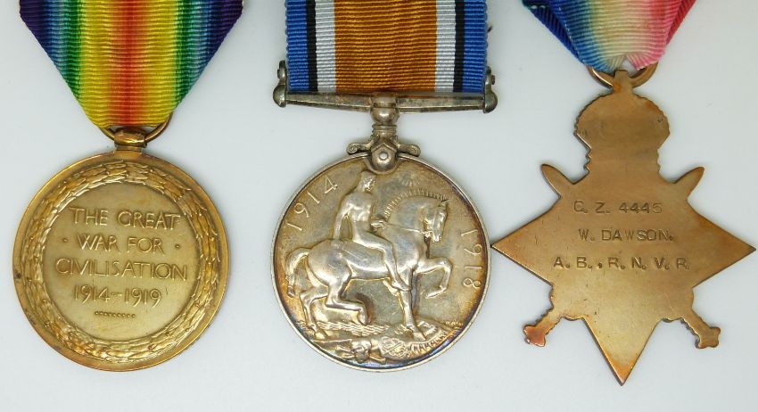 Royal Navy WWI medals comprising 1914/1915 Star, War Medal and Victory Medal, named to 4445 W Dawson, RNVR