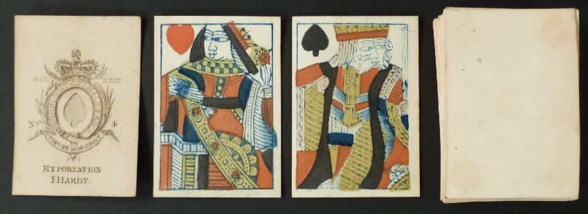 I. Hardy, England playing cards. Exportation. Garter ace. GIII, No. 4. Full length standard courts. Plain backs. 51 cards (lacking queen of spades). c1812