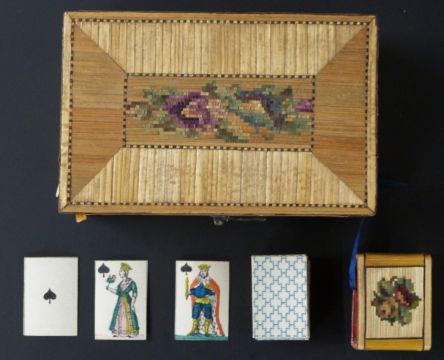 Johann Anton Steinberger, Germany playing cards. Possibly letters ‘St ‘ on shield of jack of clubs. Miniature cards 22 x 18 mm. Full length courts. Imperial eagle on shield of jack of hearts. 32 cards in miniature straw work box inside larger straw work box. c1850