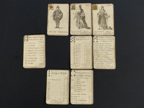 English playing card pack dealing with Kings and Queens and general knowledge. Black and white engraved cards. The suit values are a small card in the top left hand corner with full length courts, the red suit signs being coloured in. 41 cards. c1770