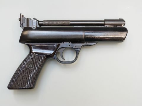 Webley Tempest .22 air pistol with shaped and chequered grips, NVSN, in original box with pellet catcher, target and pellets