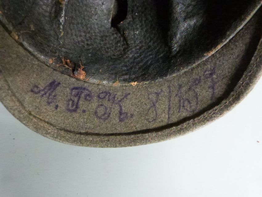 German / Prussian Army 19thc green felt pickelhaube helmet, complete with leather chin strap and leather liner with maker's name Luckenwalder label. Marked M P K 8/157 to peak