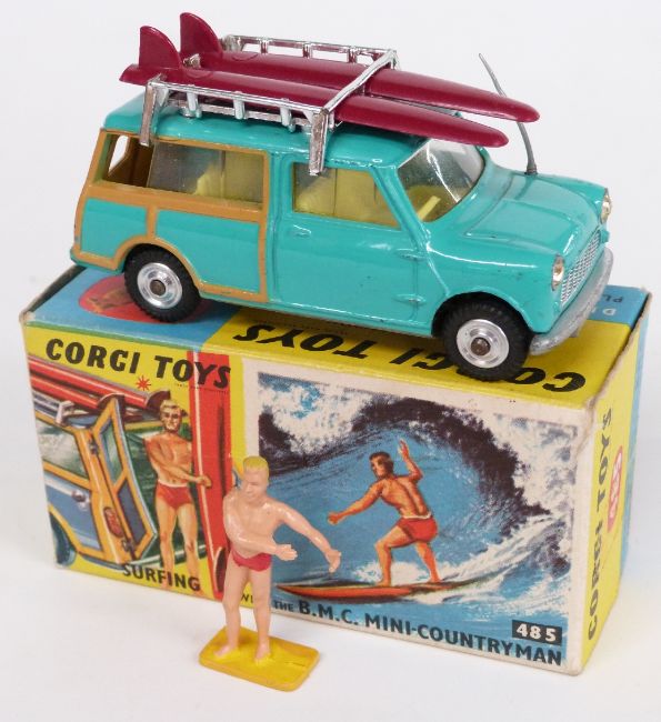 Corgi Toys diecast model car Surfing With The B.M.C. Mini-Countryman with mint green body, lemon interior, surfer and two surfboards 485, in original box.