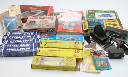 Collection of 00 gauge model railway accessories including Ratio GWR signals, goods wagon etc