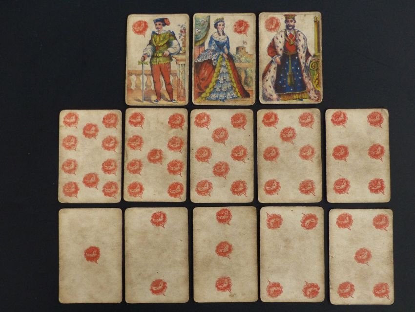 Rock Brothers and Payne, London. The New Floral playing cards. Published under the patronage of HRH, the Princess of Wales (represented as the Queen of Roses). Non standard cards. Suit signs are roses, violets, pansies and carnations. Full length courts in colourful costumes. Plain backs. 52 cards, one being a hand drawn replacement. 1863