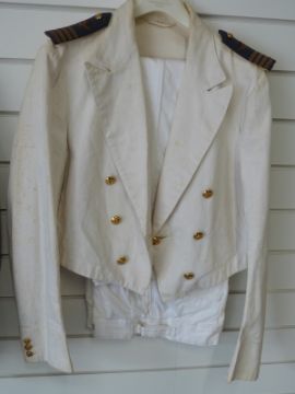 Royal Air Force officer's white trousers and jacket with shoulder boards and buttons, size small