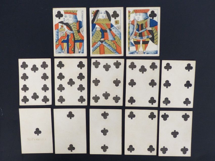 Hardy & Sons, England playing cards Old Frizzle ace. Standard full length courts. Plain backs. 52 cards including one shilling duty