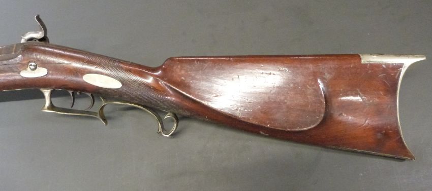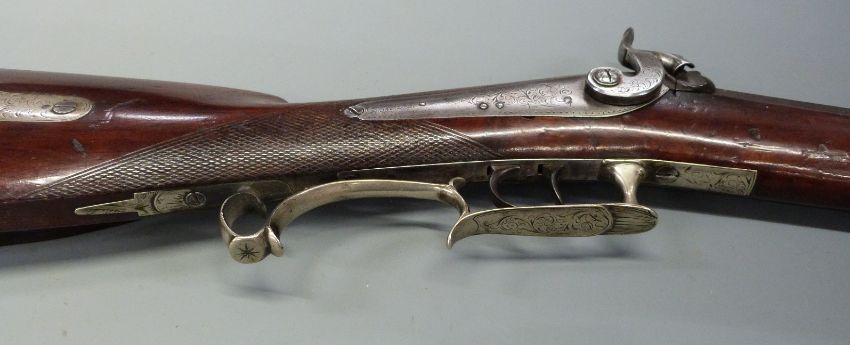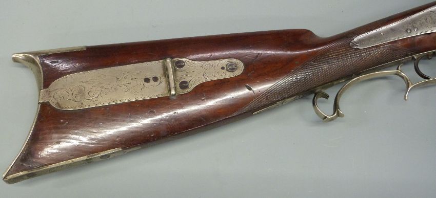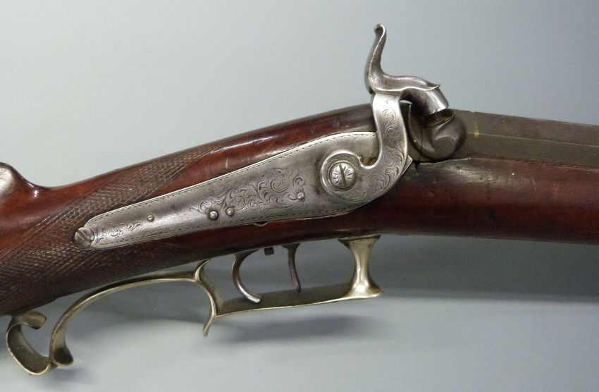American .400 Kentucky rifle with engraved lock and stylised dolphin hammer, set trigger, engraved German silver trigger guard, crescent butt plate and mounts, eagle engraved storage compartment to the right hand side of the stock, raised cheek piece to the left hand side of the stock, chequered grip, vacant cartouche at the grip, brass tipped wooden ram-rod and 28.75 inch engraved and band inlaid octagonal barrel named W. Hahn, overall length 115cm.