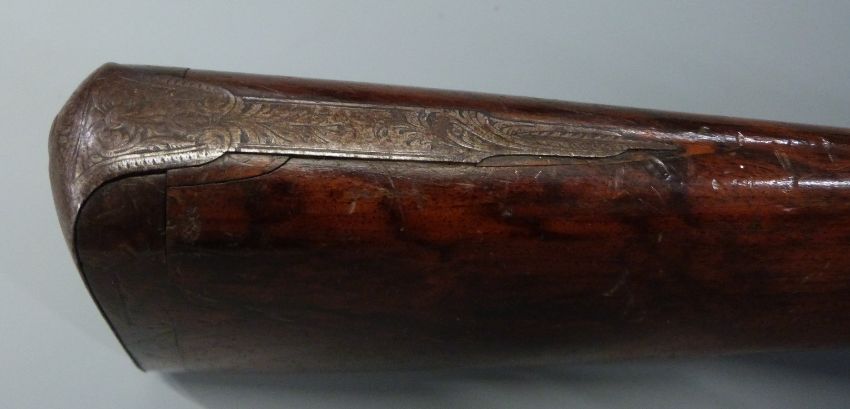 John Manton & Son side by side percussion hammer action sporting gun stock and action with finely engraved locks, stylised dolphin hammers, trigger guard, top plate, underside and butt plate, locks named 'JNo Manton & Son' double trigger, chequered grip and carved teardrop and vacant cartouche to the wrist, overall length 48.5cm, serial number 10058.
