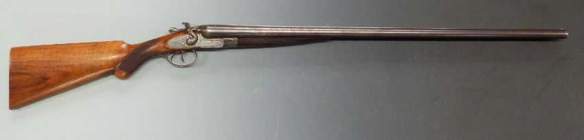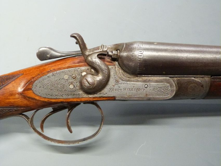 Frederick Williams 12 bore side by side hammer action shotgun with named and engraved locks, engraved underside, trigger guard, hammers, top plate and thumb lever, chequered semi-pistol grip and forend, double trigger and named 30 inch barrels, barrels choked ¼ and ¾, overall length 118cm, length of pull 36cm, serial number 108382 PLEASE NOTE THAT A VALID RELEVANT FIREARMS/SHOTGUN CERTIFICATE IS REQUIRED TO HANDLE/PURCHASE THIS ITEM.