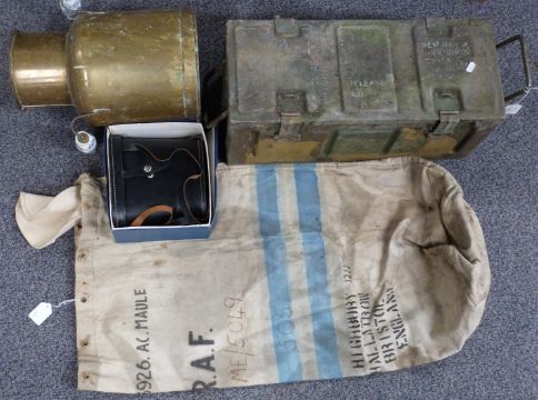 WWII era kit bag marked RAF 22933926 A C Maule, binoculars, churn and ammunition box