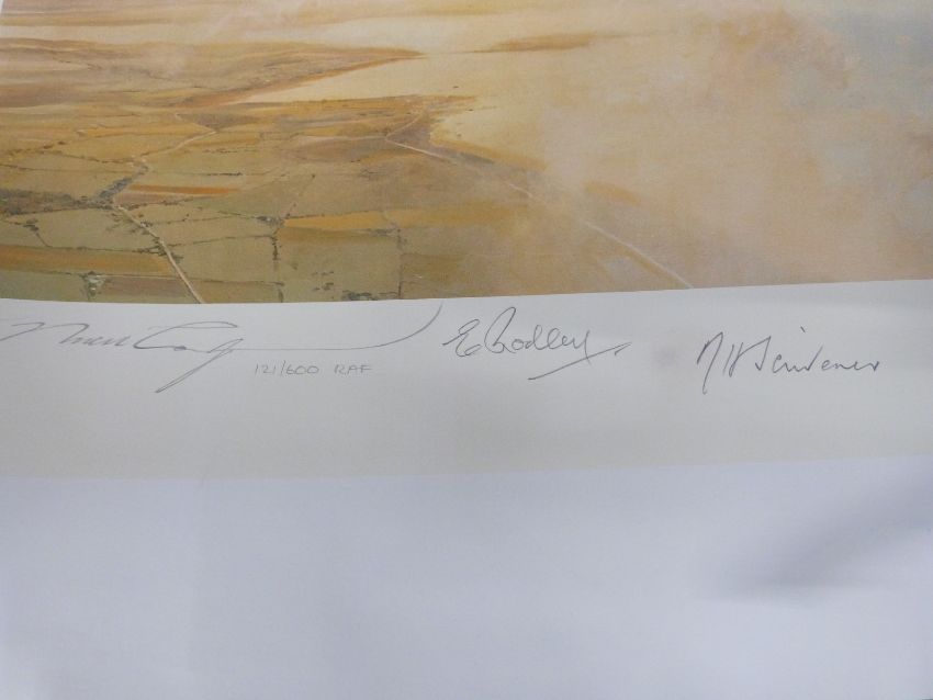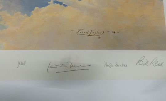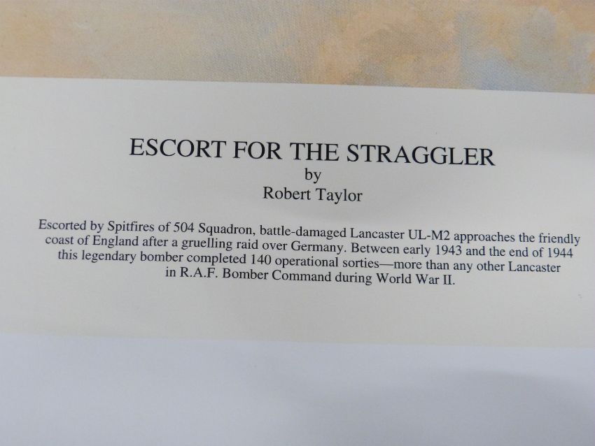 Robert Taylor signed limited edition (121/600 RAF edition) print and companion print, Escort for the Straggler, signed by the artist and crew members to both the main print and companion print