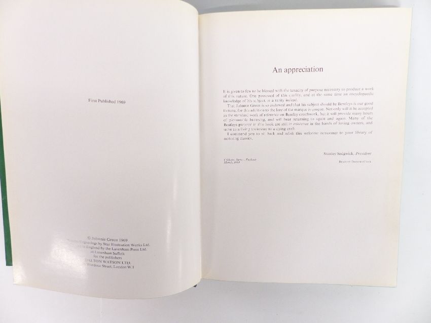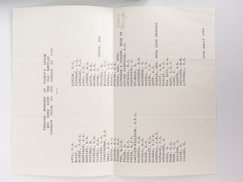 W O Bentley signed Bentley Driver's Club dinner menu signed by W O Bentley, with letter relating to the dinner, affixed into book Bentley by Johnnie Green
