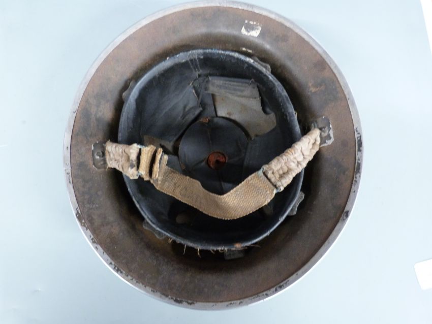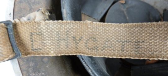 British Army WWII 'Brodie' steel helmet with liner and chin strap, the rim stamped JSS127 I 1939, named to strap D Hygate