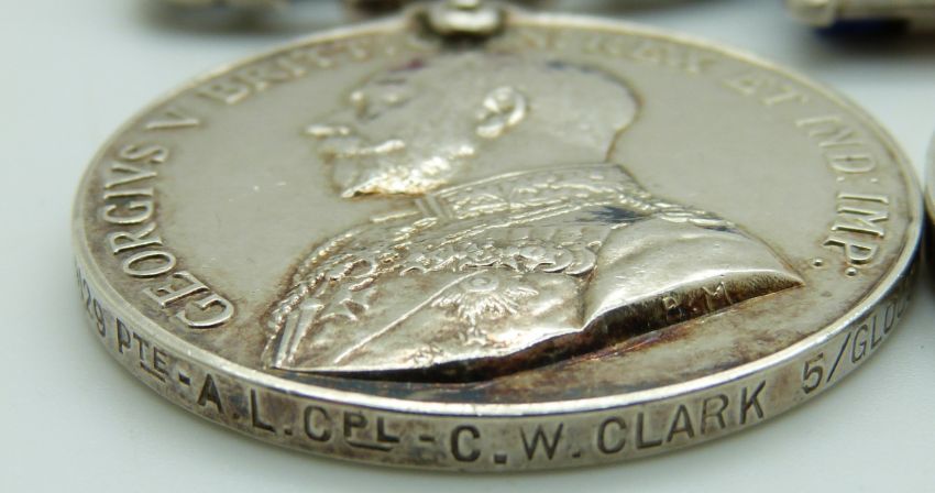 British Army WWI Military Medal named to 34129 Pte L/Cpl C W Clark, Glosters/Gloucestershire Regiment together with his War Medal and Victory Medal