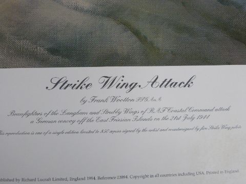 Frank Wootton signed limited edition (622/850) print Strike Wing Attack, signed by the artist and five pilots, all awarded a DFC, 58 x 75cm