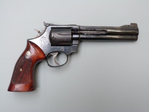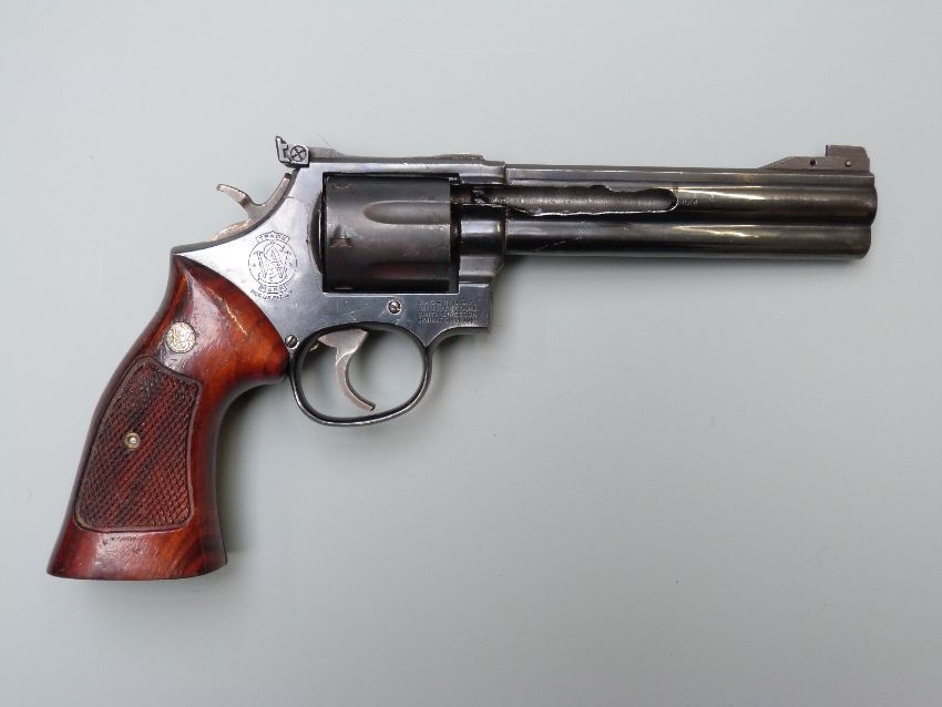 Deactivated Smith & Wesson .357 magnum six shot double action revolver with inset gilt monograms to the chequered grips, named and monogrammed frame, alignment sight and 5.75 inch barrel, overall length 32cm, in Bianchi brown leather holster, with deactivation certificate dated 2018.