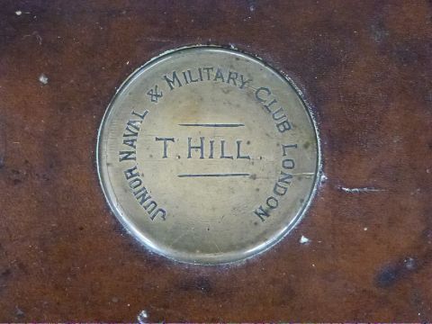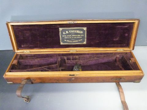 C B Vaughan brass and leather bound oak fitted shotgun case with felt lined tray lifting out to reveal storage space for 96 cartridges, brass plaque engraved 'T Hill - Junior Naval & Military Club London' and original label 'C.B. Vaughan Guns, Rifles, Binoculars, etc. Specialists In Gun Fitting 39, Strand, London, W.C.2.', stamped to the front 'Registered 4TH JANy 1861', 88 x 23 x 13cm.