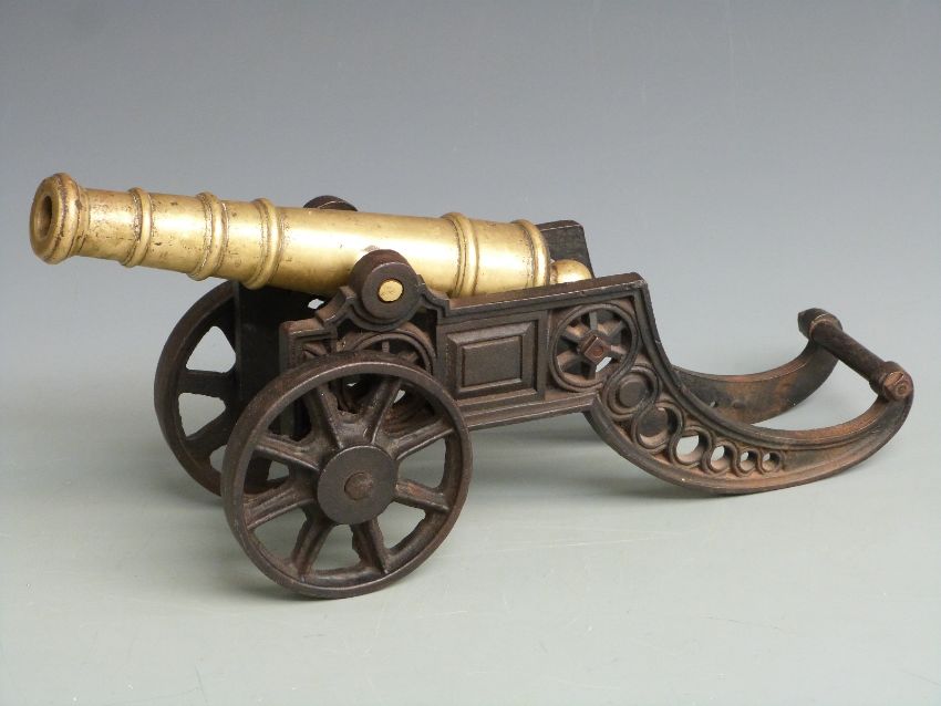 Brass barrelled desk or signalling cannon with 11.5 inch graduated multi-stage barrel on cast iron carriage, 48cm long.